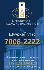 Иргэн Та Гадаад харилцааны яамны “70082222” шуурхай утасны дугаарт холбогдож, тус яамны Консулын газраас үзүүлдэг үйлчилгээний талаар мэдээлэл авах, ГХЯ, хилийн чанадад суугаа ДТГ-ын албан хаагчидтай холбоотой сахилгын болон ёс зүйн зөрчлийн асуудлаар мэдээлэл өгөх, гомдол гаргах боломжтой боллоо. Ажлын бус цагаар консулын яаралтай асуудлаар тус яамтай холбогдох бол 83042222, 83052222 дугаарын утсаар холбогдоно уу.