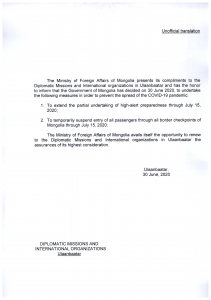Үүнтэй холбогдуулан Монгол Улсын Засийн газар 2020 оны 6 дугаар сарын 30-ны    өдрийн хуралдаанаар коронавируст халдварын цар тахлын дэгдэлтээс урьдчилан сэргийлэх зорилгоор орон даяар зарласан Өндөржүүлсэн бэлэн байдлын зэрэгт шилжүүлсэн хугацааг 2020 оны 7 дугаар сарын 15-ны өдрийг дуустал сунгах тухай УОК-ын шийдвэрийг дэмжиж, Засгийн газрын тогтоолоор баталгаажуулсан байна.