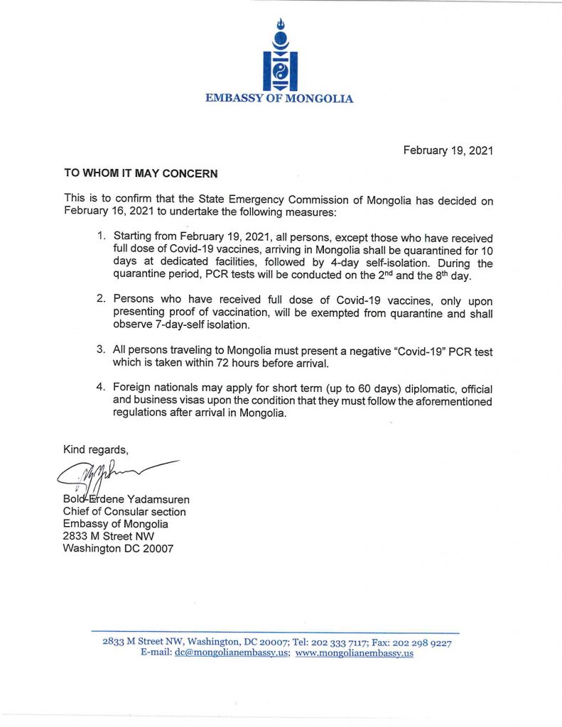 1. 2021 оны 2 дугаар сарын 19-ний өдрөөс эхлэн Монгол Улсын хилээр нэвтрэх, дархлаажуулалтад хамрагдаагүй буюу бүрэн тун аваагүй иргэдийг 10 хоног тусгаарлах бөгөөд тусгаарлалтын 2 болон 8 дахь өдөр “Ковид-19”-ийн PCR шинжилгээ авна. Тусгаарлалтын хугацаа дууссаны дараа 4 хоногийн гэрийн ажиглалтад шилжүүлнэ.