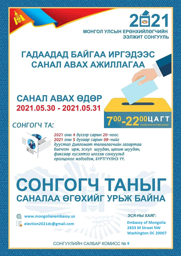 Монгол Улсын Ерөнхийлөгчийн 2021 сонгуульд санал өгөх бүртгэлээ 5 дугаар сарын 9-ний өдрөөс өмнө хийлгэж, сонгуульдаа идэвхтэй оролцохыг уриалж байна.