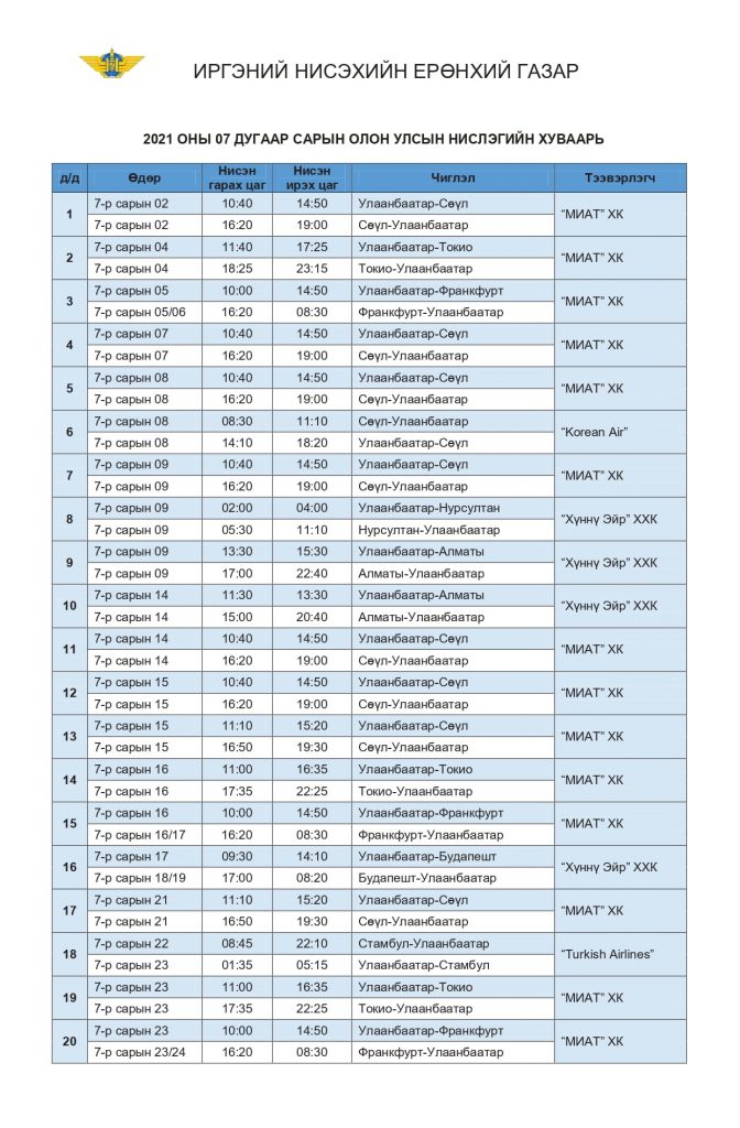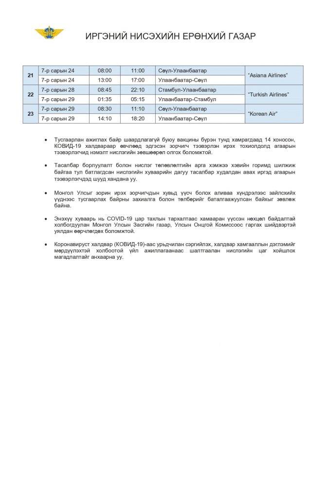 Тусгаарлан ажиглах байр шаардлагагүй буюу вакцины бүрэн тунд хамрагдаад 14 хоносон, КОВИД-19 халдвараар өвчлөөд эдгэсэн зорчигч тээвэрлэн ирэх тохиолдолд агаарын тээвэрлэгчид нэмэлт нислэгийн зөвшөөрөл олгох боломжтой. Тасалбар борлуулалт болон нислэг төлөвлөлтийн арга хэмжээ хэвийн горимд шилжиж байгаа тул батлагдсан нислэгийн хуваарийн дагуу тасалбар худалдан авах иргэд агаарын тээвэрлэгчдэд шууд хандана.