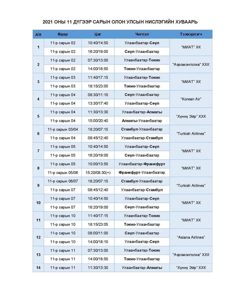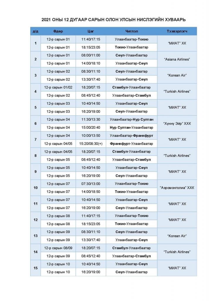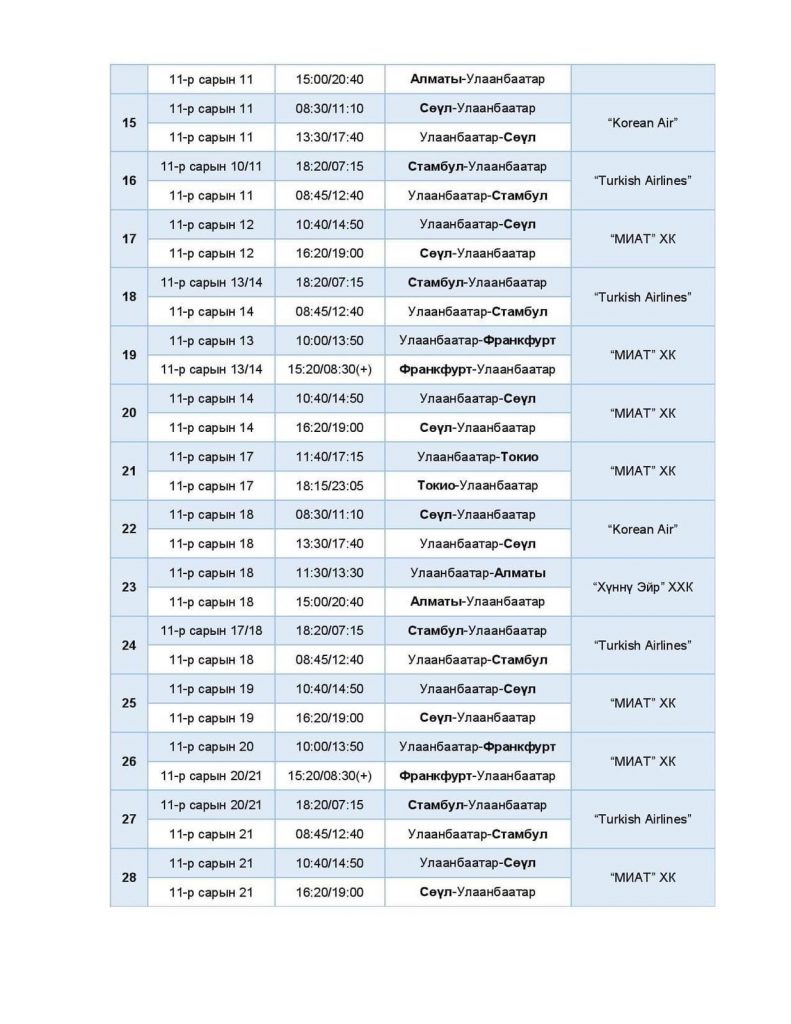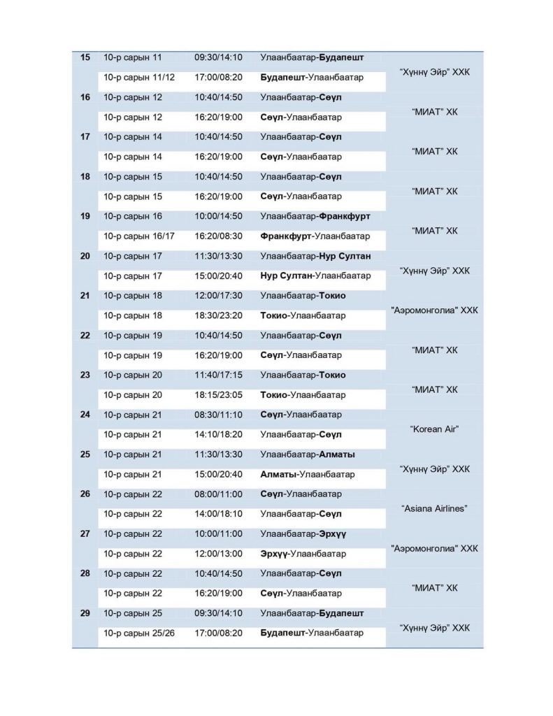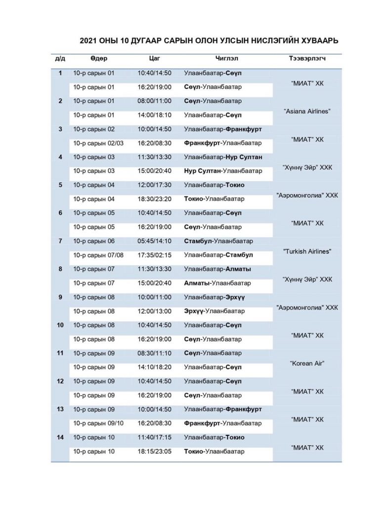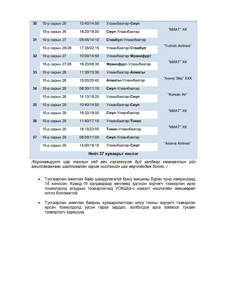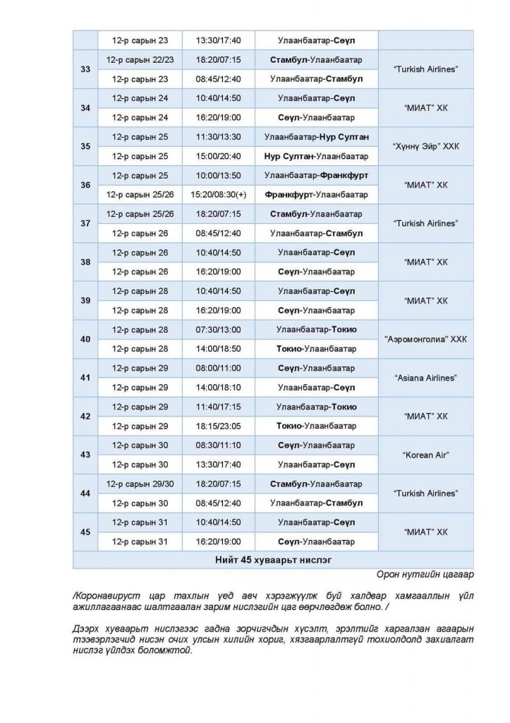 Тасалбар борлуулалт болон нислэг төлөвлөлтийн арга хэмжээ хэвийн горимд шилжиж байгаа тул батлагдсан нислэгийн хуваарийн дагуу тасалбар худалдан авах иргэд агаарын тээвэрлэгчдэд шууд хандана