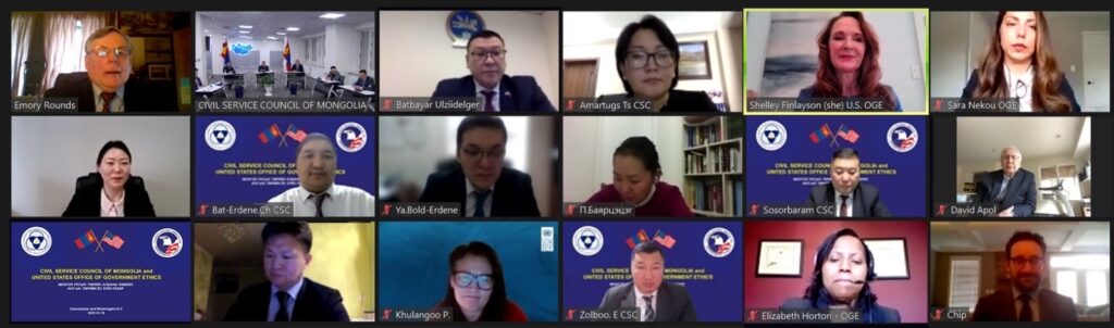 Монгол Улсын Төрийн албаны зөвлөл болон АНУ-ын Төрийн ёс зүйн газар хооронд 2022 оны 1 дүгээр сарын 19-ний өдөр цахим уулзалт зохион байгуулагдав. Уулзалтыг монголын талаас ТАЗ-ийн дарга Б.Баатарзориг, америкийн талаас Төрийн ёс зүйн газрын дарга Эмори Э.Роундс нар ахалж, Элчин сайд Ө.Батбаяр, Төрийн албаны зөвлөлийн гишүүд болон хоёр талын холбогдох байгууллагын бусад албан тушаалтнууд оролцов.