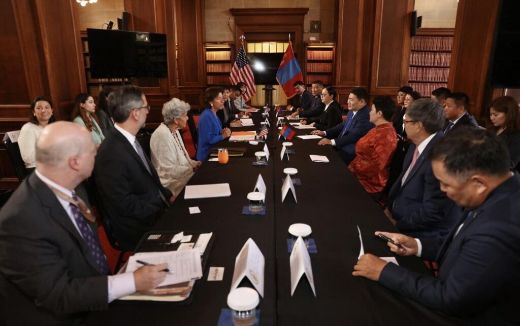 Монгол Улсын Ерөнхий сайд Л.Оюун-Эрдэнэ АНУ-ын Худалдааны сайд Жина Раймондог наймдугаар сарын 4-ний өдөр хүлээн авч уулзлаа.Ерөнхий сайд Л.Оюун-Эрдэнэ уулзалтын эхэнд Монгол Улсын гуравдагч хөрш, Стратегийн түнш АНУ-тай худалдаа, эдийн засгийн хамтын ажиллагааг улам өргөжүүлэн гүнзгийрүүлэхийн чухлыг тэмдэглээд Монгол Улсын эдийн засгийг төрөлжүүлэх, хөрөнгө оруулалтыг нэмэгдүүлэх хүрээнд уул уурхай, цэвэр эрчим хүч, хөдөө аж ахуйн салбарт хамтран ажиллах боломжийн талаар ярилцав.Худалдааны сайд Ж.Раймондо Монгол Улсын ардчилал, ил тод байдлыг бэхжүүлэх, авлигатай тэмцэх болон хувийн хэвшилд суурилсан эдийн засгийн өсөлтийг дэмжих чиглэлд гарч буй үр дүнг сайшаахын зэрэгцээ эрх зүйн орчныг сайжруулах, олон улсын сайн туршлагыг нэвтрүүлэхэд дэмжлэг үзүүлэн хамтран ажиллахаа илэрхийлэв.Талууд хоёр улсын бизнесийн төлөөллийг 2023 онд харилцан айлчлуулах, шинэчлэн байгуулсан Стратегийн гуравдагч хөршийн түншлэлийн эдийн засгийн хамтын ажиллагааны тухай Замын зураглалын хэрэгжилтийг хангахад анхаарахаа нотлов.Дараа нь Монгол Улсын Ерөнхий сайд Л.Оюун-Эрдэнэ АНУ-ын Сансар судлал сансрын удирдлагын газар (НАСА)-т зочилж, тус байгууллагын дэд дарга, сансрын нисгэгч хатагтай П.Мэлрой, АНУ-ын Үндэсний сансрын зөвлөл (ҮСЗ)-ийн нарийн бичгийн дарга Ш.Пираг болон НАСА, ҮСЗ, Төрийн департаментын ахлах албан тушаалтнуудтай уулзав.Ерөнхий сайд Л.Оюун-Эрдэнэ Сансрын зөвлөлийн Ерөнхийлөгчийн албыг давхар хашдаг АНУ-ын Дэд Ерөнхийлөгч К.Харристай Монгол, Америкийн сансрын хамтын ажиллагааг хөгжүүлэх асуудлаар санал солилцсоноо тэмдэглээд энэ хүрээнд НАСА-тай нягт хамтран ажиллах сонирхолтой байгаагаа илэрхийлэв.АНУ-ын ҮСЗ-ийн зүгээс сансрын салбарт Монгол Улсын Засгийн газартай иж бүрэн, өргөн хамтын ажиллагааг хөгжүүлэхийн төлөө байгаагаа илэрхийлээд “Алсын хараа-2050” Монгол Улсын урт хугацааны хөгжлийн бодлогын хүрээнд сансар судлалын чиглэлд хамтран ажиллах олон боломж байгааг илэрхийлэв.Талууд сансрын шинжлэх ухаан, технологийн дэвшлийг иргэдийн өдөр тутмын амьдрал, эдийн засгийн өсөлтийг сайжруулахад ашиглах, сансрын технологи, техникийн дэвшлийг уур амьсгалын өөрчлөлт, байгалийн гамшгаас урьдчилан сэргийлэх, сансар судлалын мэргэжилтнүүдийг бэлтгэх зэрэгт хамтран ажиллахад санал нэгдлээ.