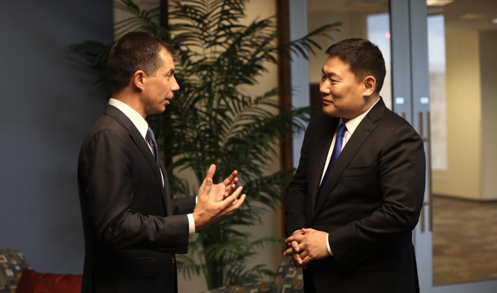 Монгол Улсын Ерөнхий сайд Л.Оюун-Эрдэнэд АНУ-ын Тээврийн сайд Пит Бүттэжэйж бараалхав. Энэ үеэр хоёр орны тээврийн салбарын хамтын ажиллагааг шинэ түвшинд гаргах боломжуудын талаар санал солилцов.Ерөнхий сайд Л.Оюун-Эрдэнэ энэхүү айлчлал хоёр улсын Стратегийн түншлэлийг бэхжүүлж, эдийн засгийн агуулгаар баяжуулах, энэ хүрээнд талууд Монгол Улс, АНУ-ын хооронд олон жил яригдсан “Агаарын тээврийн тухай Монгол Улсын Засгийн газар, АНУ-ын Засгийн газар хоорондын хэлэлцээр”-ийг байгуулж буйд баяртай байгаагаа илэрхийлэв.Энэхүү хэлэлцээрийг байгуулснаар Монгол Улс, АНУ хооронд шууд нислэгтэй болох, хоёр талын эдийн засгийн хамтын ажиллагааг өргөжүүлэх, иргэд харилцан зорчих, худалдаа, аялал жуулчлалын салбарт шинэ боломж нээх, бизнесийн салбар дахь хамтын ажиллагааг идэвхжүүлэхэд томоохон түлхэц болно гэдэгт итгэж байгаагаа талууд онцлов.Мөн энэ үеэр “Тээврийн салбарын харилцан сонирхсон асуудлаар хамтран ажиллах тухай Монгол Улсын Зам, тээврийн хөгжлийн яам, Америкийн Нэгдсэн Улсын Тээврийн яам хоорондын Санамж бичиг”-т Монгол Улсын Зам тээврийн хөгжлийн сайд С.Бямбацогт, АНУ-ын Тээврийн сайд Пит Бүттэжэйж нар гарын үсэг зурлаа.Санамж бичиг байгуулснаар хоёр тал томилогдсон төлөөлөгчөөрөө дамжуулан байнгын харилцаа холбоотой ажиллана. Тээврийн салбарт хоёр улсын ашиг сонирхолд нийцсэн аливаа төсөл, хөтөлбөр, арга хэмжээг хэрэгжүүлэх, хамтарсан судалгаа шинжилгээ хийх, төр болон хувийн хэвшлийн байгууллагуудын харилцаа, хамтын ажиллагаа, түншлэлийг дэмжих зэрэг олон ажлыг талууд хамтран хэрэгжүүлэхээр санамж бичигт тусгасан байна. Тухайлбал, аюулгүй, найдвартай, үр бүтээмжтэй, тогтвортой, тээврийн нэгдсэн системийг хөгжүүлэхийн тулд төрийн болон хувийн хэвшлийн нөөц бололцоо, туршлагыг уялдуулж, бүх төрлийн тээврийн харилцан сонирхсон гол асуудлаар тээврийн түншлэлийн харилцаа, хамтын ажиллагааг бэхжүүлнэ. Энэ хүрээнд авто зам, хурдны авто зам, төмөр зам, дотоодын усан зам, транзит тээвэр, иргэний агаарын тээвэр, аюултай ачааны тээвэрлэлт зэрэг тээврийн бүх төрлөөр АНУ-тай хамтарч ажиллана.