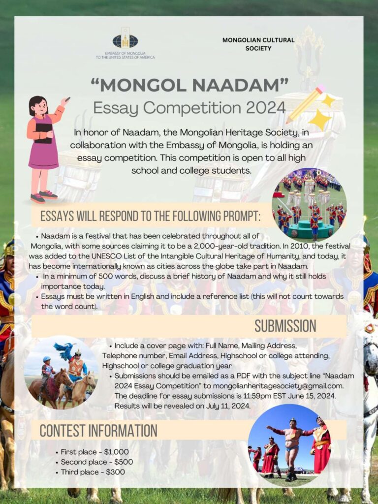 In honor of Naadam, the Mongolian Heritage Society, in collaboration with the Embassy of Mongolia, is holding an essay competition. This competition is open to all high school and college students.