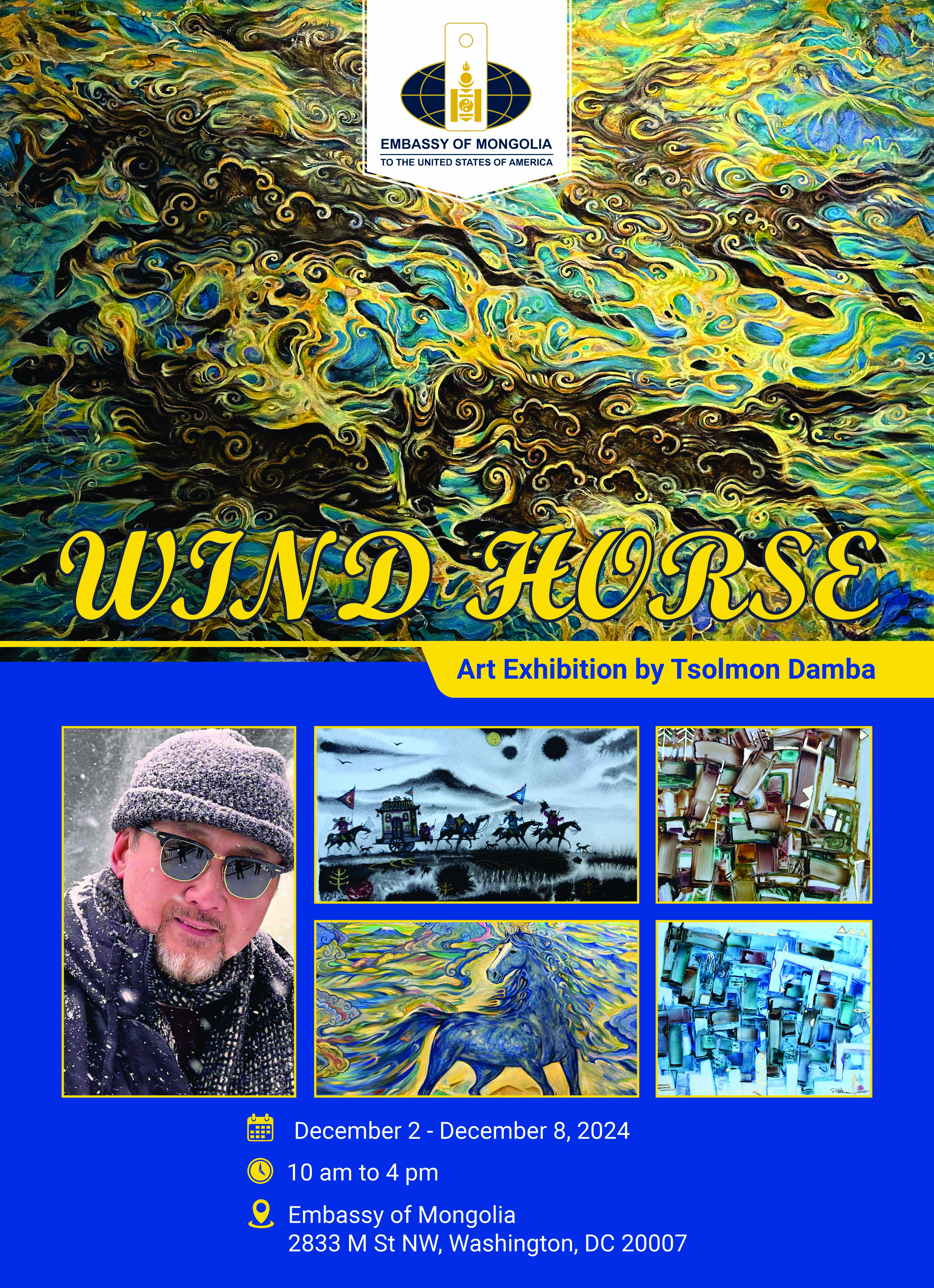 Монгол Улсаас Америкийн Нэгдсэн Улсад суугаа Элчин сайдын яамны санаачилгаар Бүгд Найрамдах Улсаа тунхаглан, анхдугаар Үндсэн хуулиа баталсны 100 жилийн ойн өдрийг тохиолдуулан зураач Д.Цолмонтой Tsolmon Art хамтран АНУ-ын Вашингтон хотноо “WIND HORSE” уран зургийн үзэсгэлэнг зохион байгуулах гэж байна.