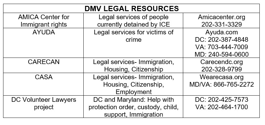 DMV буюу Вашингтон ДиСи, Мэриланд, Виржиниа мужид амьдарч буй иргэн та дараах хуулийн байгууллагуудтай холбогдож, тусламж, зөвлөгөө авах боломжтой. Мөн шаардлагатай тохиолдолд ЭСЯ-ны шуурхай утсаар холбогдохыг хүсье: 202-374-6274.