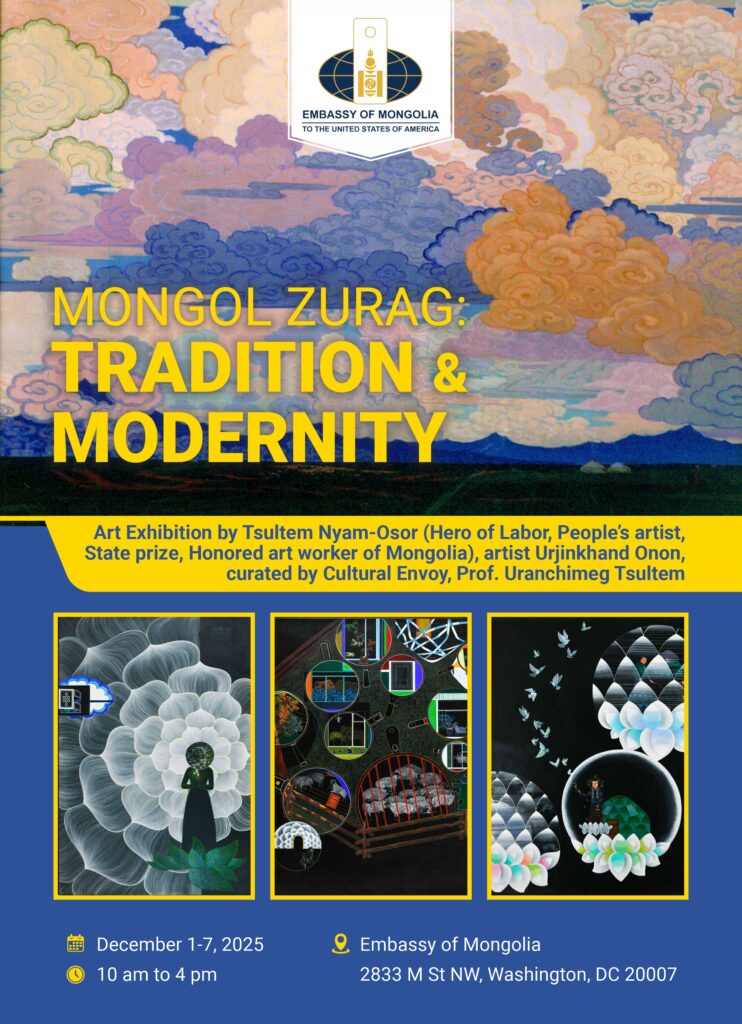 “MONGOL ZURAG: TRADITION AND MODERNITY” үзэсгэлэн Элчин сайдын яамны байранд 2025 оны 12 дугаар сарын 2-ноос 7-ны өдрүүдэд 10-16 цагийн хооронд зохион байгуулагдах тул Та бүхнийг хүрэлцэн ирж үзэхийг урьж байна.